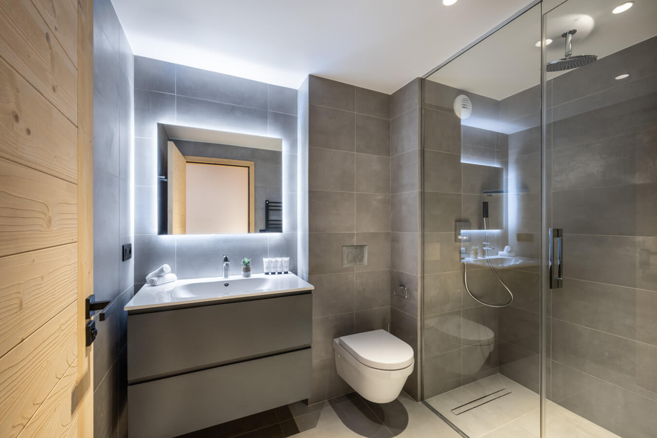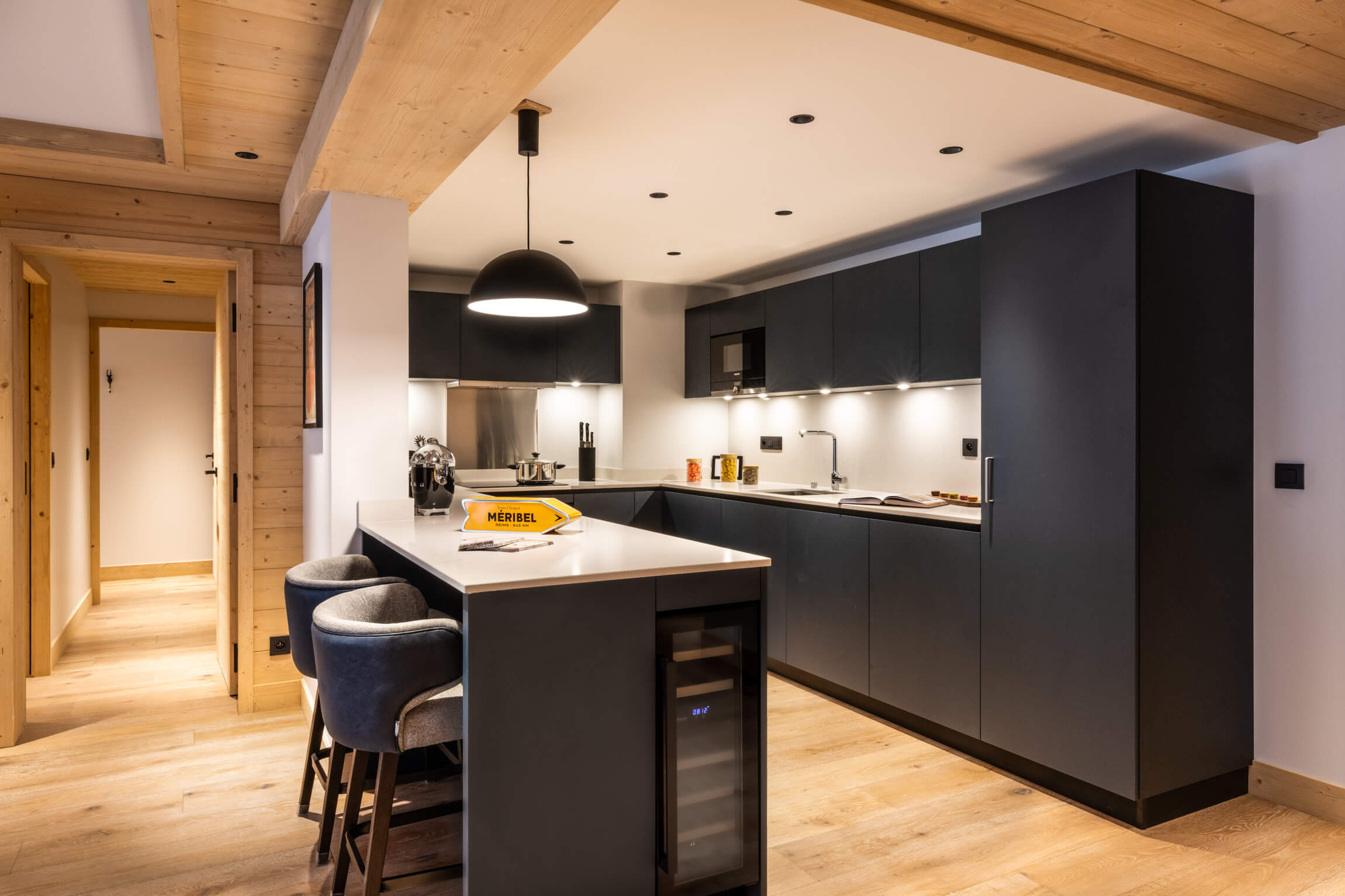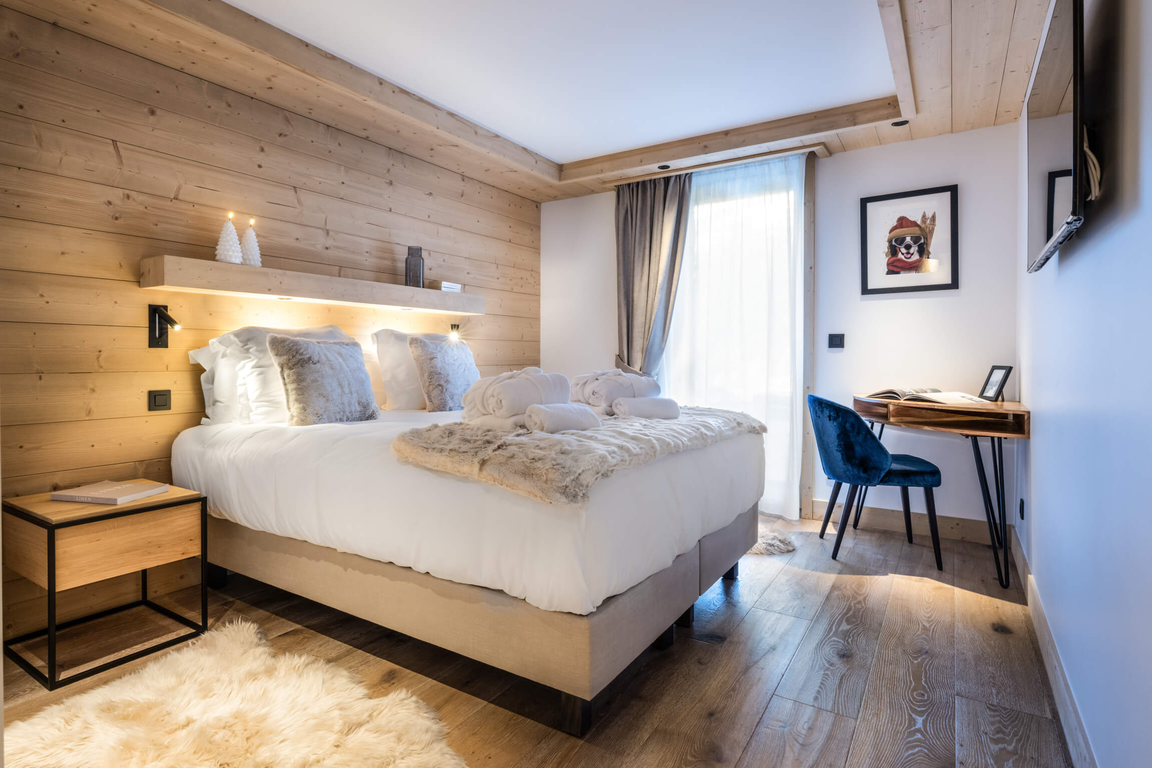 Diese Chalet-Wohnung verfügt über drei Schlafzimmer mit Doppelbett (180 × 200 cm) sowie über drei Badezimmer mit Dusche. Der Wohnbereich bietet eine Sitzecke, eine voll ausgestattete Küche, einen Holzofen und einen nach Südwesten ausgerichteten Balkon. Das Chalet ist nach allen Himmelsrichtungen ausgerichtet, sodass Licht und Aussicht sich im Laufe des Tages ständig ändern. Zur Ausstattung gehören Haushaltsgeräte wie Geschirrspüler, Nespresso-Kaffeemaschine, notwendige Küchenutensilien usw.