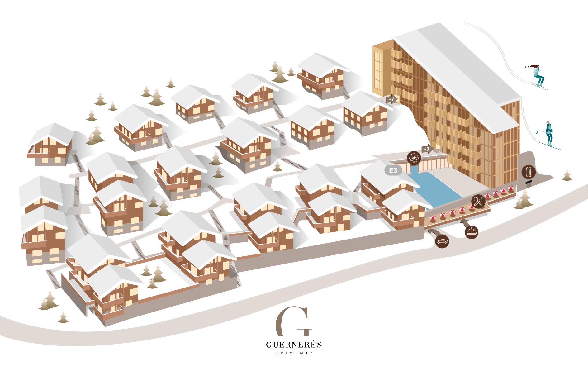 Die Chalet-Wohnung E3, ein Duplex auf der ersten und obersten Ebene des Chalets E, am rechten Nordende in der unteren Reihe des Chalet-Bereichs des Resorts Guernerés, bietet eine Fläche von 100 m² und Platz für bis zu 8 Personen maximal.