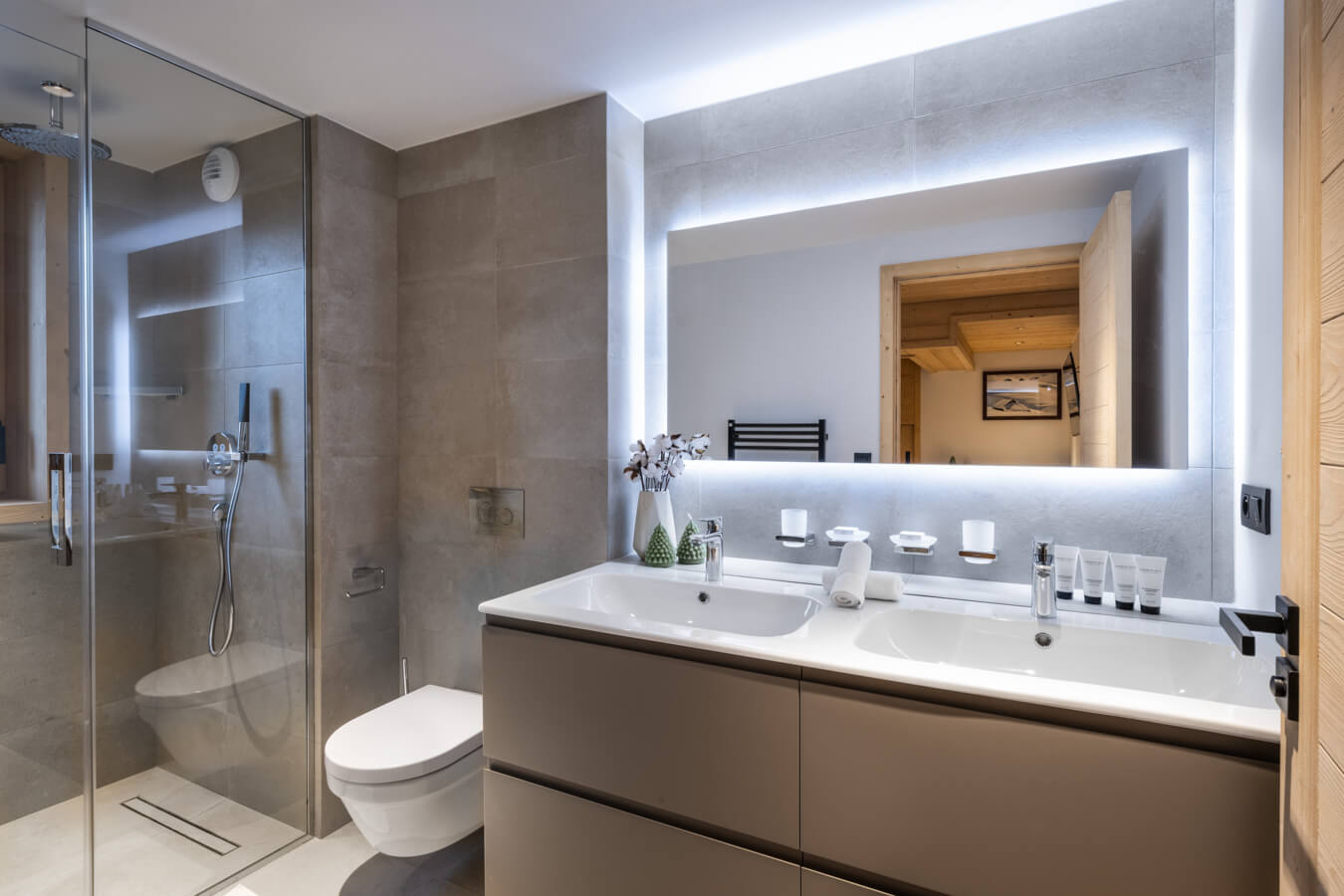 Diese Chalet-Wohnung verfügt über drei Schlafzimmer mit Doppelbett (180 × 200 cm), eine Kabine mit zwei Einzelbetten (90 × 190 cm) im Durchgang zwischen den beiden Schlafzimmern sowie über zwei Badezimmer mit Dusche und Badewanne. Der Wohnbereich bietet eine Sitzecke mit Fernseher, eine voll ausgestattete Küche, einen Holzofen und einen nach Süden ausgerichteten Balkon. Das Chalet ist nach Süden, Osten und Norden ausgerichtet. Zur Ausstattung gehören Haushaltsgeräte wie Waschmaschine, Geschirrspüler, Nespresso-Kaffeemaschine, notwendige Küchenutensilien usw.