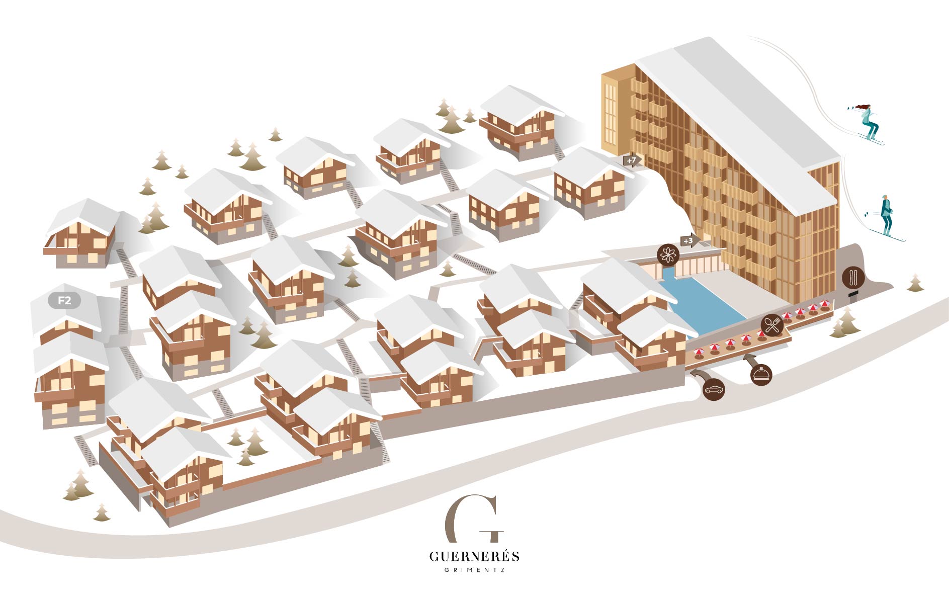 Das Chalet F2, am linken, südlichen Ende der mittleren Reihe der Chalets im Resort Guernerés gelegen, erstreckt sich über drei Ebenen und bietet Platz für bis zu 10 Personen, maximal 6 Erwachsene.