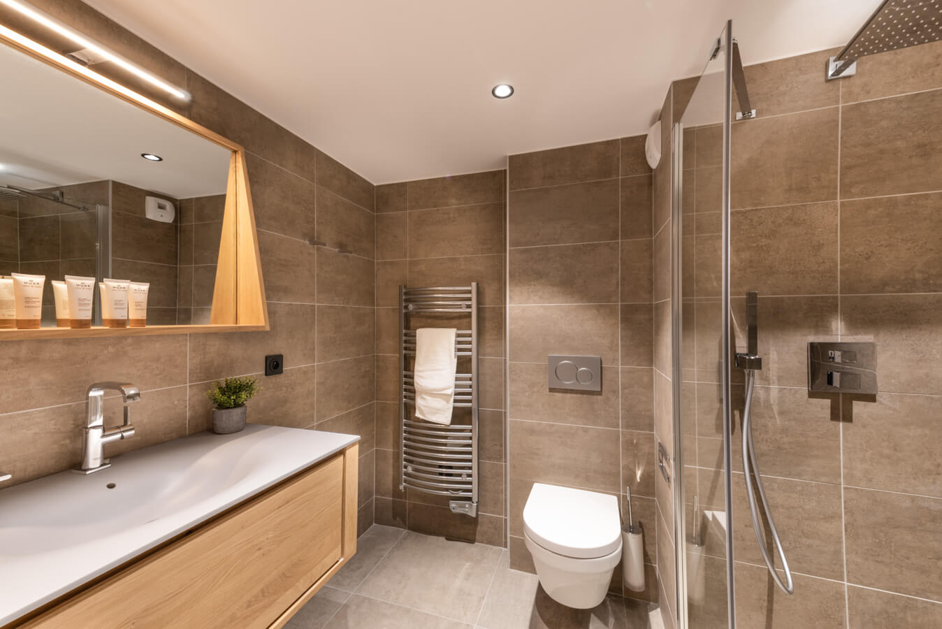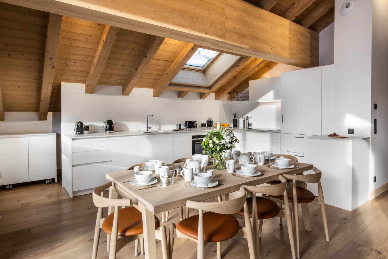 Dieses freistehende Chalet auf drei Ebenen verfügt über drei Schlafzimmer mit Doppelbett, ein Kabinenzimmer ohne Fenster mit Etagenbett sowie drei Badezimmer mit Dusche und Badewanne. Der Wohnbereich bietet eine Sitzecke mit Fernseher, eine komplett ausgestattete Küche, einen Holzofen und Außenbereiche mit freiem Blick auf die umliegenden Gipfel. Das Chalet ist nach allen Himmelsrichtungen ausgerichtet und bietet so den ganzen Tag über wechselndes Licht und Ausblicke. Zur Ausstattung gehören Haushaltsgeräte wie Geschirrspüler, Nespresso-Kaffeemaschine, Küchenutensilien etc.