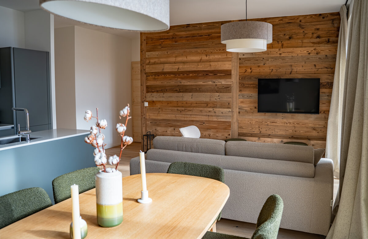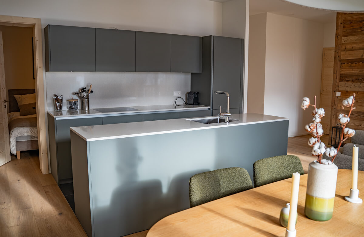 Diese Wohnung verfügt über zwei Schlafzimmer mit Doppelbetten (180 × 200 cm, 160 × 200 cm), ein fensterloses Schlafzimmer mit Doppelbett (160 × 200 cm) sowie über zwei Badezimmer, eines davon mit Badewanne. Der Wohnbereich bietet eine Sitzecke mit Fernseher und eine voll ausgestattete offene Küche. Möblierte Balkone ergänzen den Wohnraum. Zur Ausstattung der Wohnung gehören Haushaltsgeräte wie Waschmaschine, Geschirrspüler, Nespresso-Kaffeemaschine, notwendige Küchenutensilien usw.