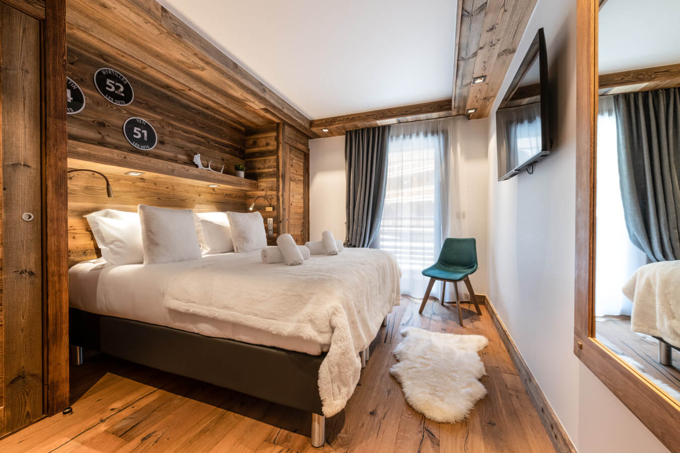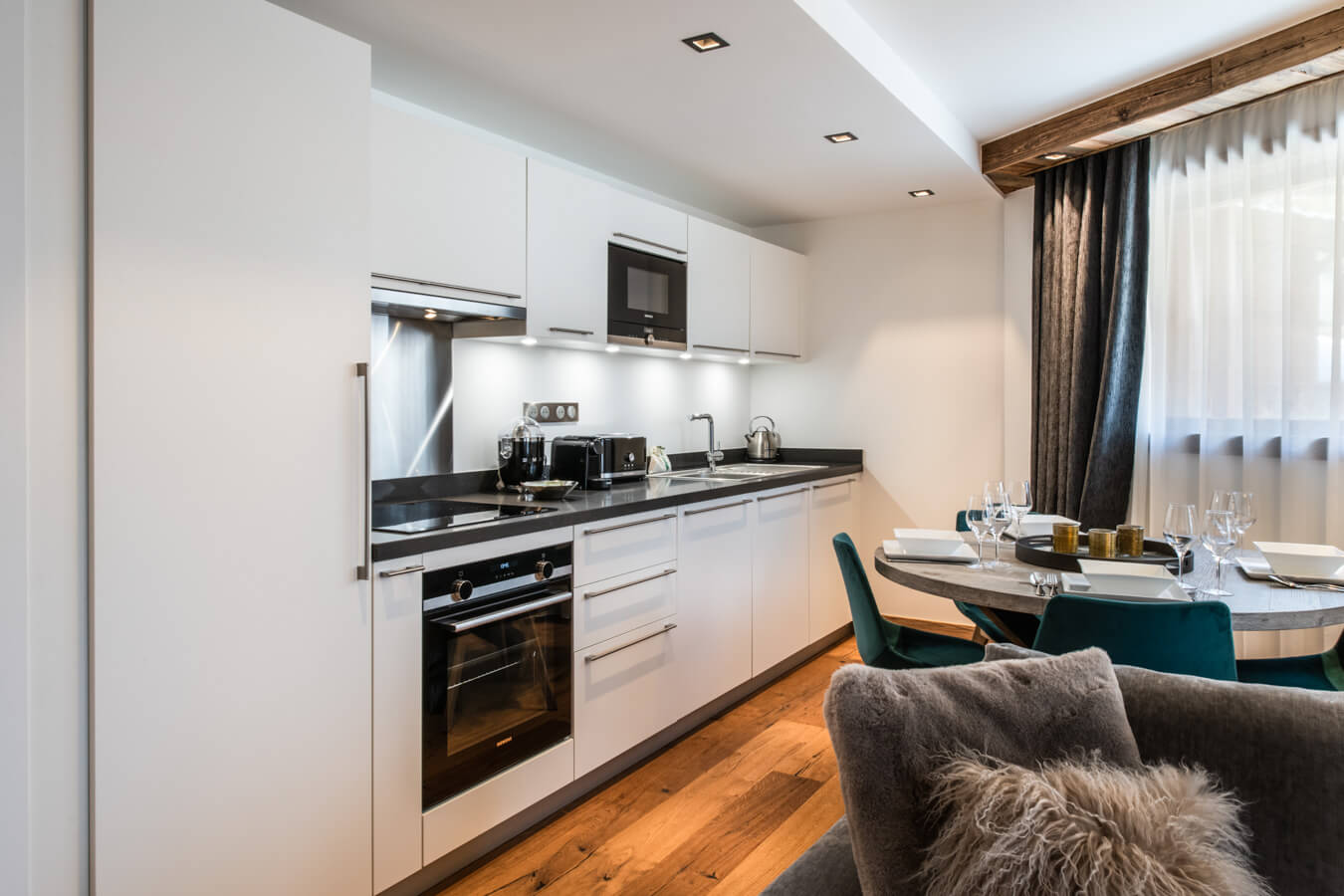 Diese Wohnung verfügt über zwei Schlafzimmer mit Doppelbetten (180 × 200 cm, 140 × 200 cm), ein fensterloses Schlafzimmer mit Doppelbett (180 × 200 cm), ein Kabinenschlafzimmer mit Etagenbett sowie über zwei Badezimmer. Der Wohnbereich bietet eine Sitzecke mit Fernseher und eine voll ausgestattete offene Küche. Möblierte Balkone ergänzen den Wohnraum. Zur Ausstattung der Wohnung gehören Haushaltsgeräte wie Waschmaschine, Geschirrspüler, Nespresso-Kaffeemaschine, notwendige Küchenutensilien usw.