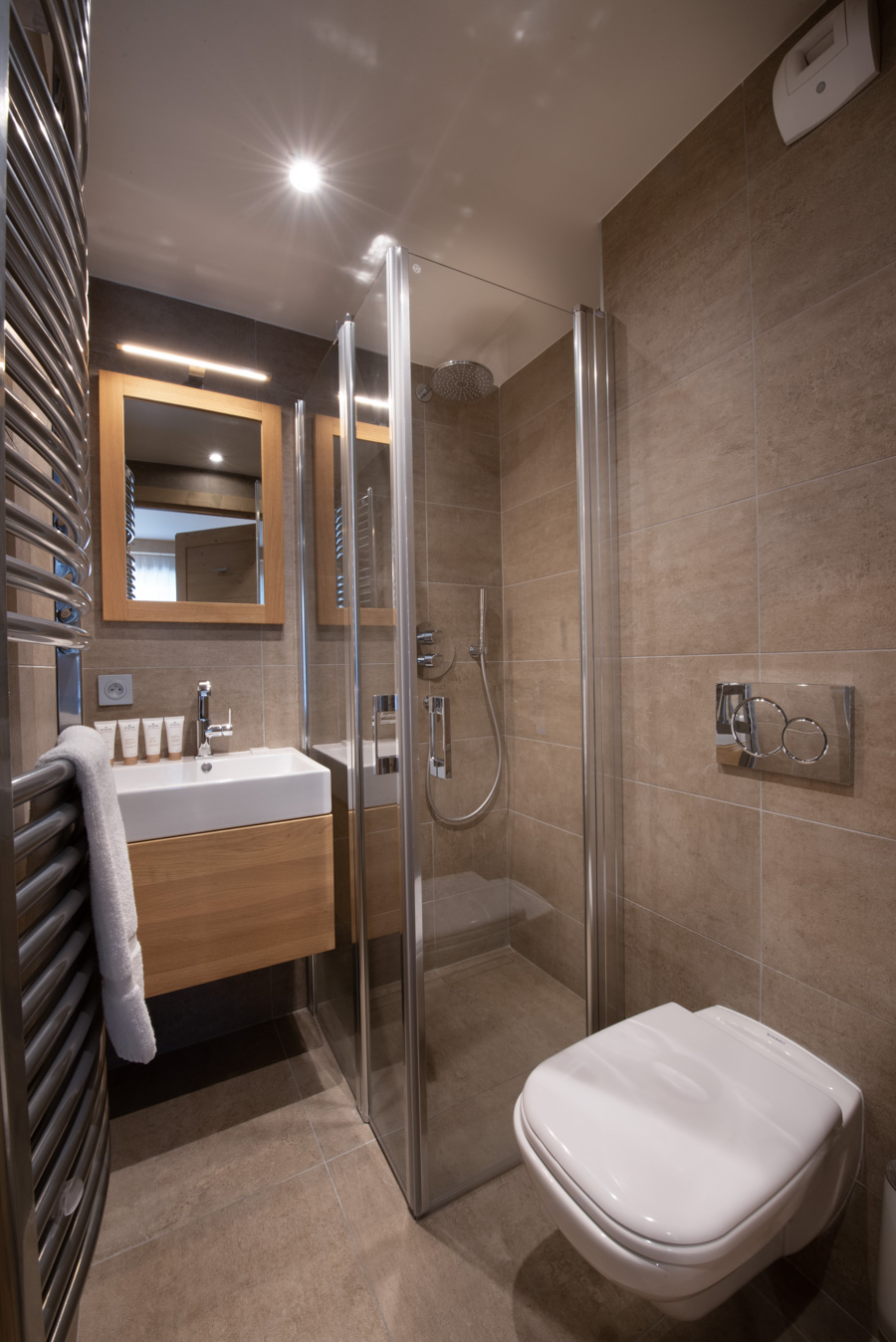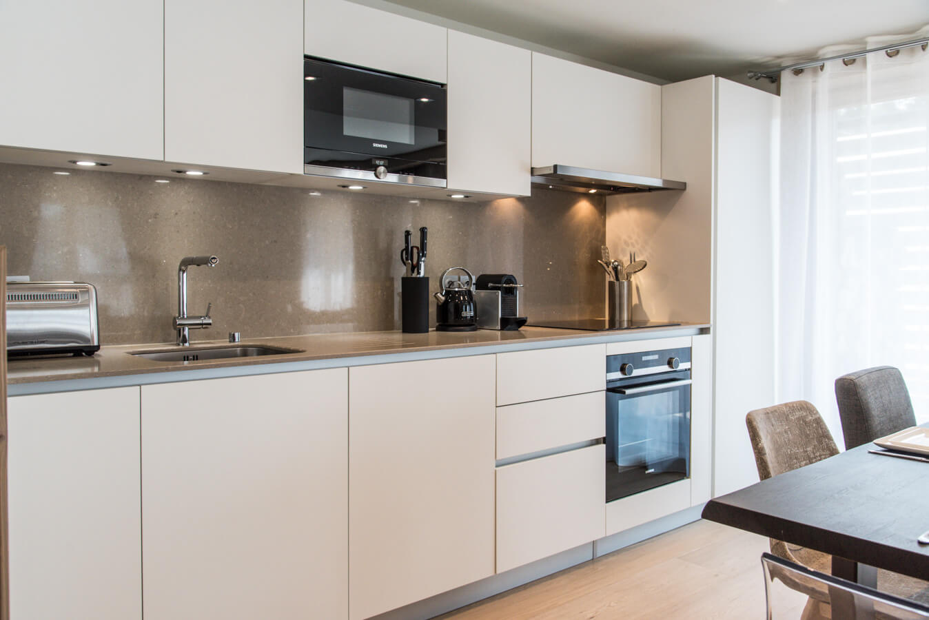 Diese Wohnung verfügt über fünf Schlafzimmer mit einem Doppelbett, ein fensterloses Kabinen-Schlafzimmer mit einem Einzelbett sowie über fünf Badezimmer, eines davon mit Badewanne. Der Wohnbereich ist mit einer Sitzecke und einem Fernseher sowie einer komplett ausgestatteten offenen Küche eingerichtet. Möblierte Balkone runden den Wohnraum ab. Zur Ausstattung gehören Haushaltsgeräte wie eine Waschmaschine, ein Geschirrspüler, eine Nespresso-Kaffeemaschine, Küchenutensilien usw.