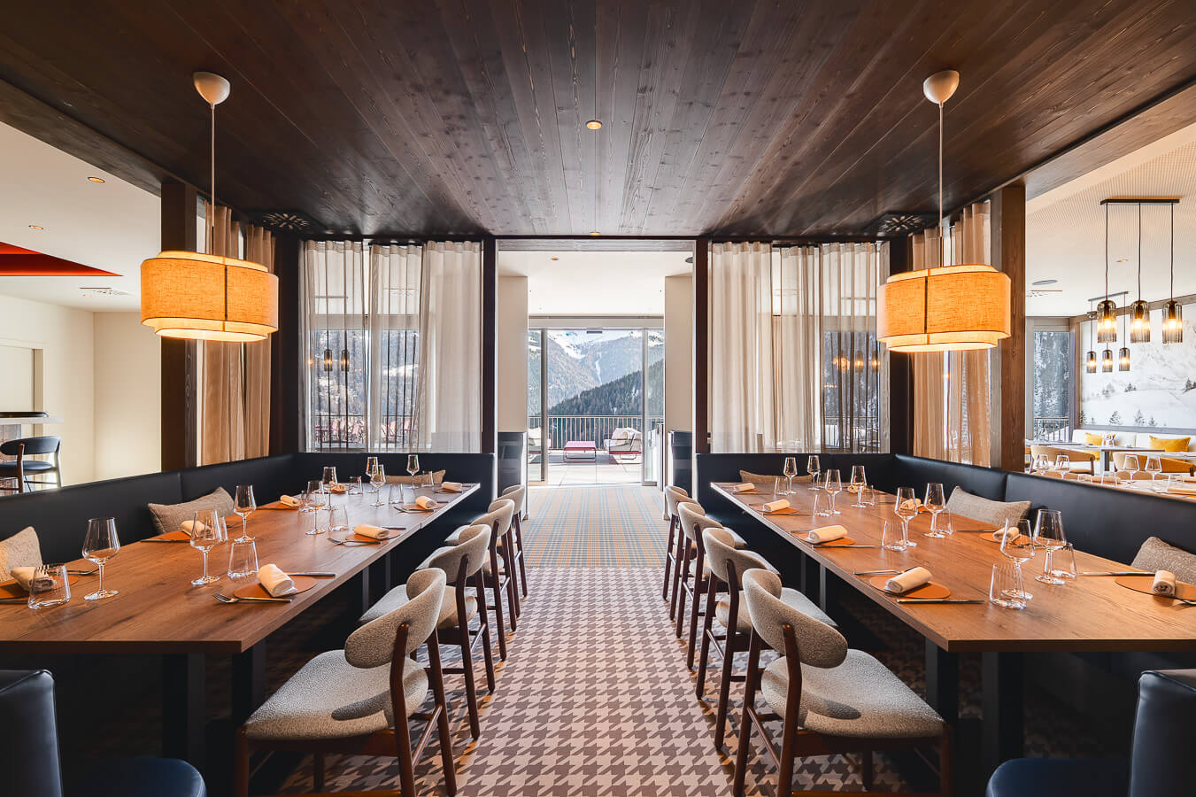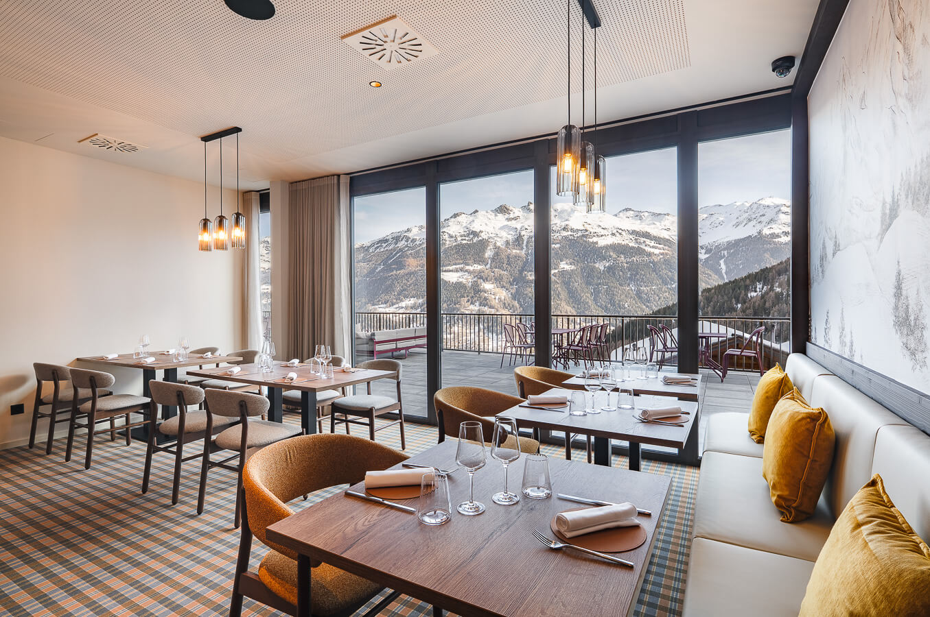 In einer gemütlichen und urigen Atmosphäre lädt Sie das Restaurant Nava im ersten Stock der 5-Sterne-Ferienanlage Guernerés ein, seine außergewöhnliche Terrasse mit spektakulärem Blick auf die Berge und die majestätischen Pointes de Nava zu genießen. Die holzgetäfelte alpine Atmosphäre bietet einen ruhigen Rückzugsort für den kulinarischen Genuss. Hier schafft die Liebe zum Detail ein ideales Ambiente, in dem Komfort, sommerliche Aromen und Geselligkeit zu einem unvergesslichen kulinarischen Erlebnis in den Bergen verschmelzen.